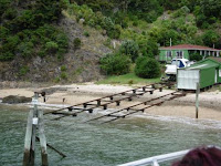 On our last full sailing day, there was still no wind, so we motored back towards Auckland via Tiritiri Matangi Island. This is a bird reserve where all natural predators have been eradicated, and all the trees are so low that you are practically at eye level with the birds. We only had an hour to explore so some people chose to walk into the woodland to try to see birds, but others took the short walk along the beach track. I opted for the latter. There was too much foot traffic on the beach path to hope that we would see any birds, though halfway along, there were 3 little blue penguin nesting boxes. These looked like huge rocks topped with a wooden lid, complete with handle. On lifting up the lid, you could peer down into the "nest" through the glass - inside each one was a huge, fat, fluffy bird, so huge in fact that I wondered how on earth they got in there in the first place.